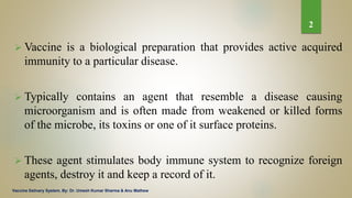 NEW TRENDS IN VACCINE DELIVERY SYSTEMS 2. National Center for Biotechnology Information. A vaccine typically contains an agent that resembles a disease-causing microorganism and is often made from weakened or killed forms of the microbe its toxins or.